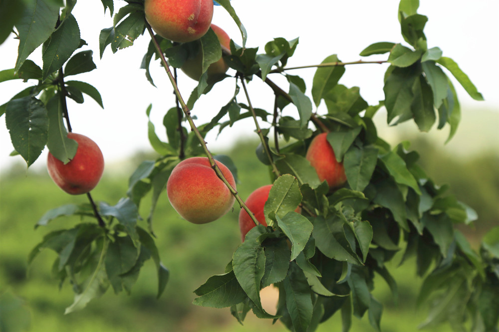红红的桃挂满枝头 水分足,甜度高, 一口下去,汁水四溢 现摘现吃安逸得很!